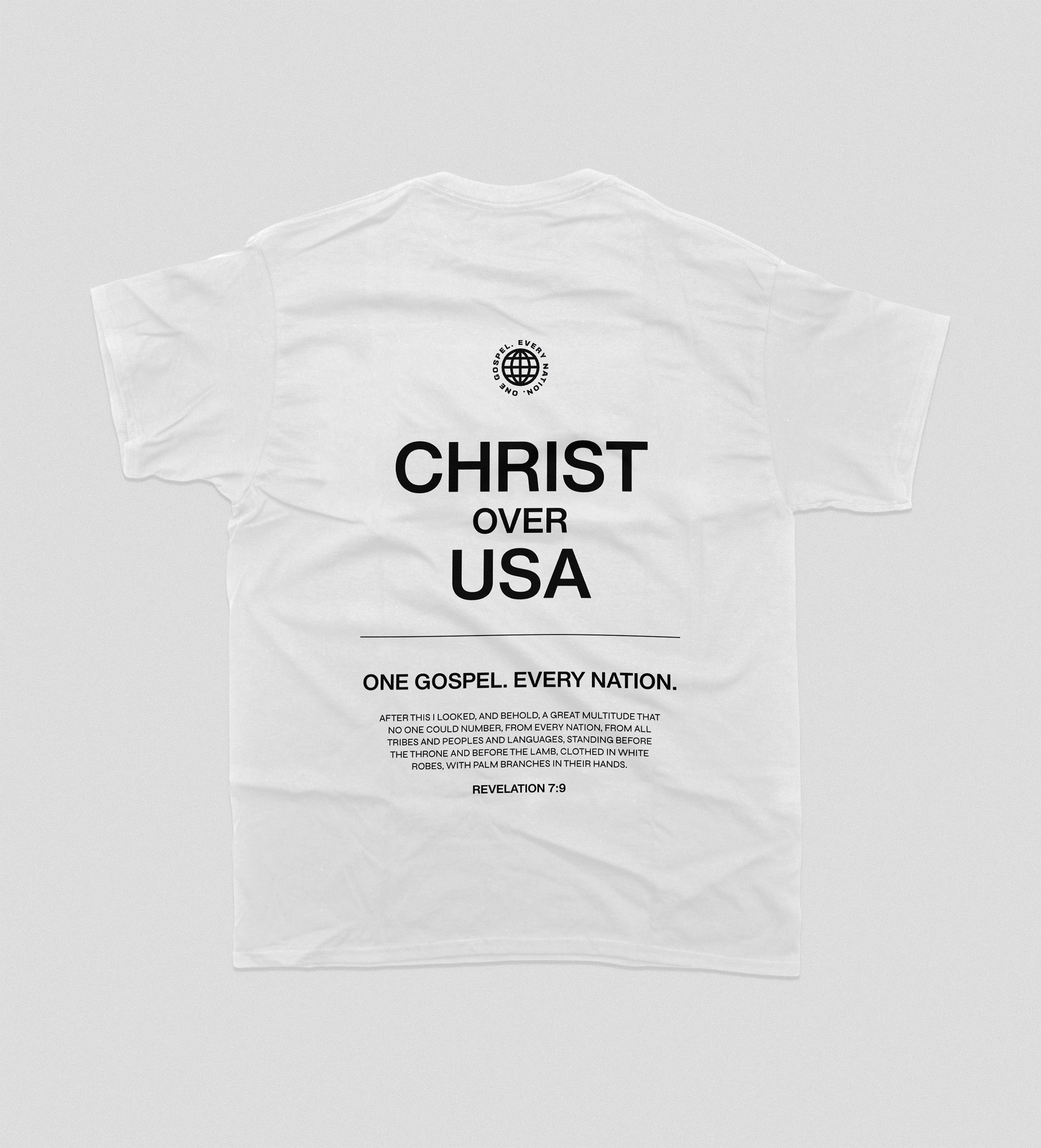 Part of the Christ over Nations Collection, this piece represents USA—declaring the name of Jesus in the English language across the front and proclaiming “Christ Over USA” on the back. Inspired by Revelation 7:9, this design honors the unity of believers from every tribe and tongue, all standing before the Lamb.